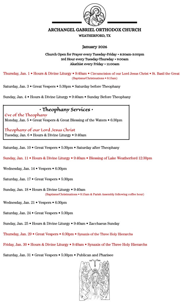 • Annual Parish Meeting January 18, 2026 at 12:15 pm – 1:45 pm Archangel Gabriel Orthodox Christian Church, 109 N Line St, Weatherford, TX 76086, USA