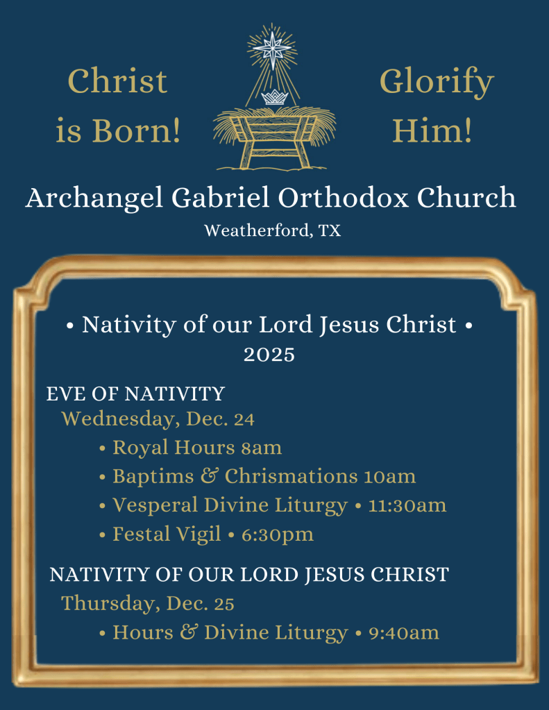 • Hours & Divine Liturgy • The Nativity of our Lord Jesus Christ December 25, 2025 at 9:40 am – 12:00 pm Archangel Gabriel Orthodox Christian Church, 109 N Line St, Weatherford, TX 76086, USA