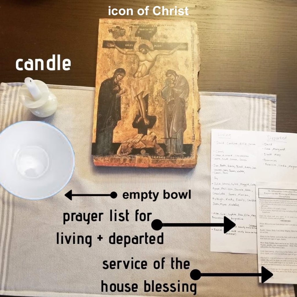 - An icon of our Savior (if the table is not set up in the icon corner or home altar).